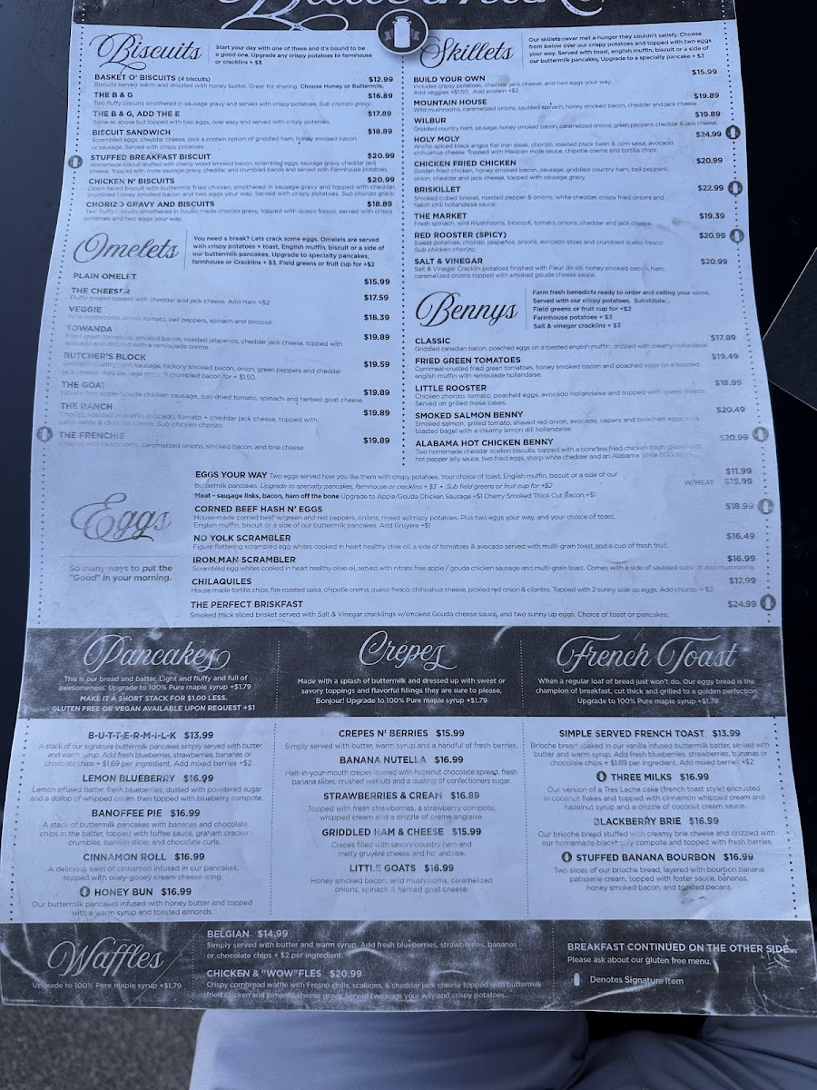 The menu features a variety of hearty and familiar choices, from warm buttermilk pancakes and cinnamon roll pancakes to savory dishes like the salmon benedict or the C B Hash N' Eggs. You’ll also find interesting twists such as bourbon cherry French toast and a range of satisfying sides like fried green tomatoes or sweet potatoes. For those seeking a lighter option, offerings like avocado toast bring a fresh, vibrant touch that complements the cafe’s calm atmosphere.